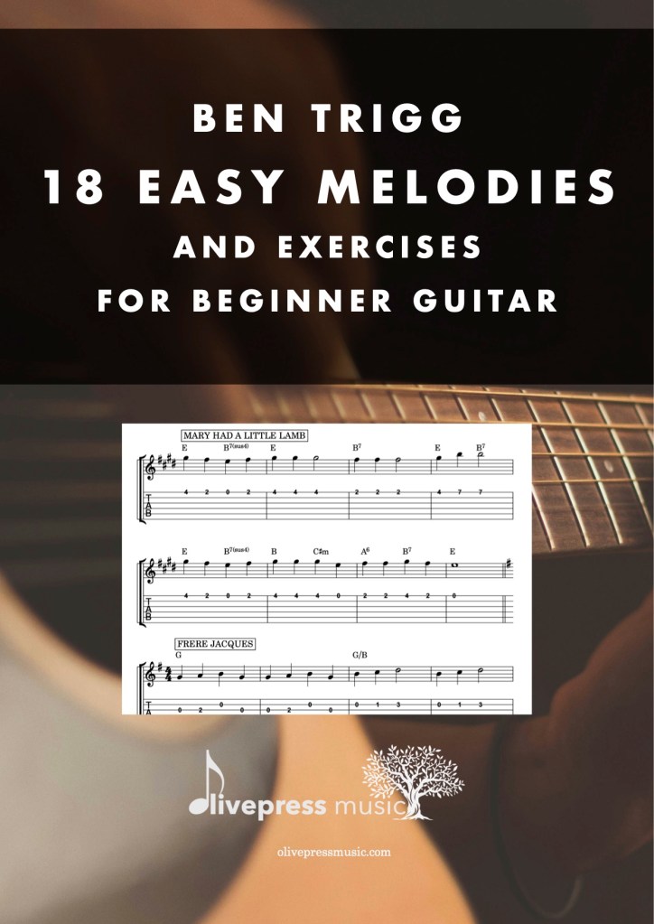 18 Easy Melodies and Exercises for Beginner Guitar was forged in the real-world situations of one-to-one teaching of young learners. It comprises a variety of well-known melodies and things-to-try (‘exercises’!) that utilise the first four frets primarily on the top E to G strings, making it accessible for most young beginners. I like to enhance my print-outs with colour coding of the strings (Blue for B, G for Green, Dark (Black) for D!).